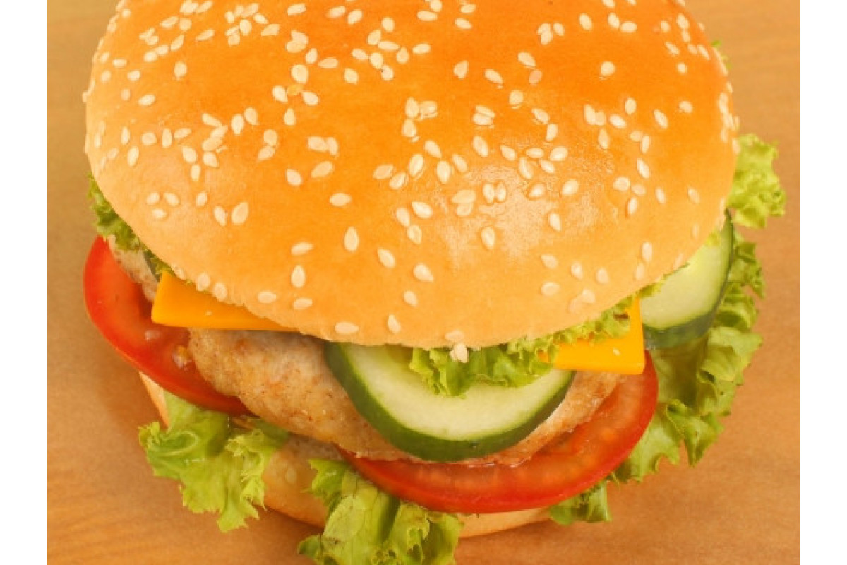 Куриная котлета, свежий огурец, соленый огурчик, лук красный, помидор, салат айсберг, булочка, фирменный соус.