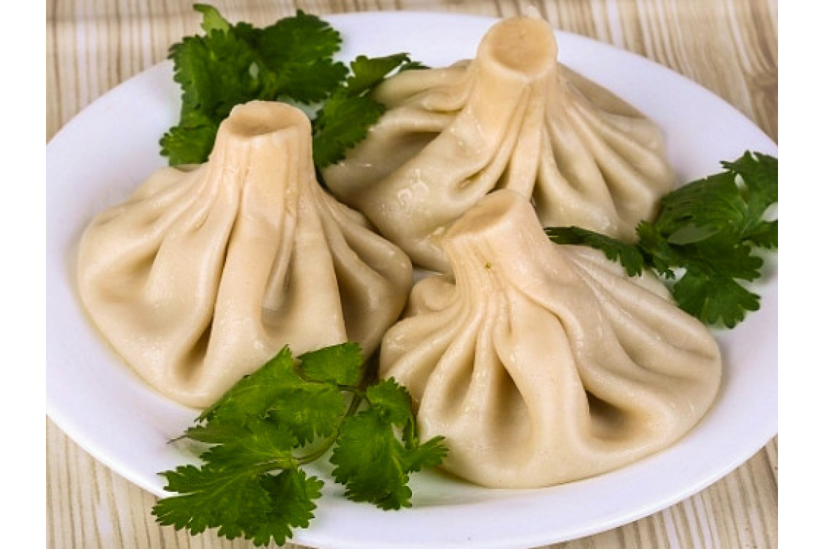Хинкали с говядиной, подаются с белым чесночным соусом (сметана, майонез, чеснок). 3 шт. ..