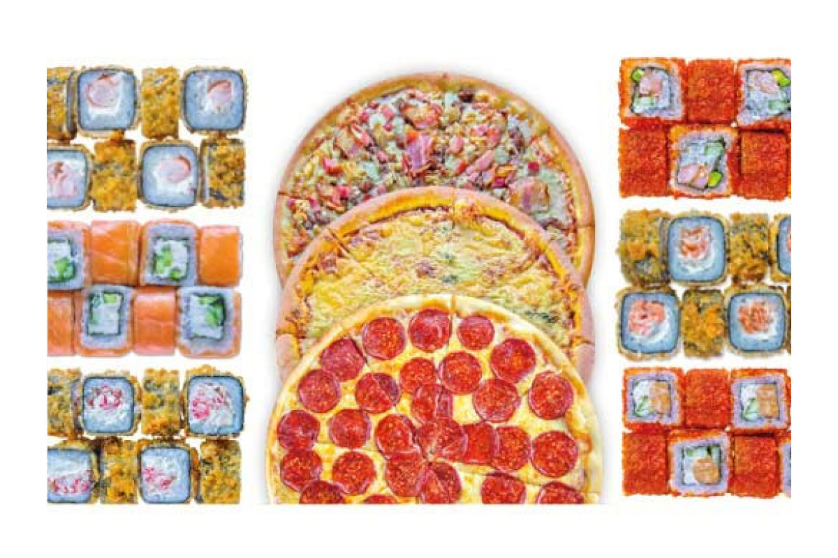 Пицца: Пепперони 30 см, 4 сыра 30 см, Мясной пир 30 см. Роллы: Калифорния, Калифорния с креветкой, Филадельфия Темпурные роллы с креветкой, с лососем, с крабом.
