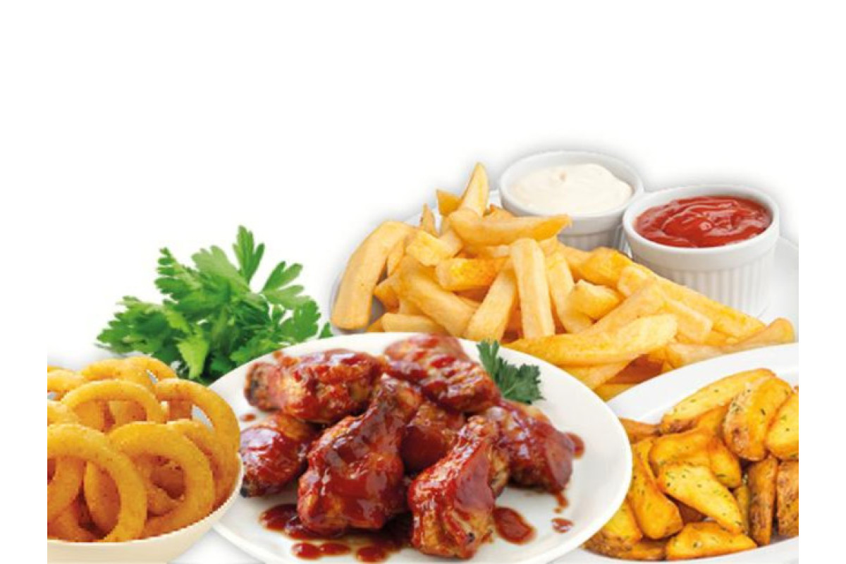 Картофель фри, картофель по-деревенски, луковые кольца, крылышки в соусе BBQ, крылья в острой панировке, кольца кальмара, нагетсы...