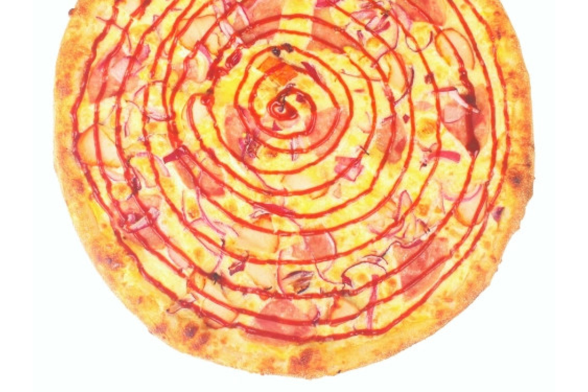 Фирменное тесто, сырный соус, сыр Моцарелла, филе цыпленка, ветчина, красный лук, соус барбекю, тесто традиционное.