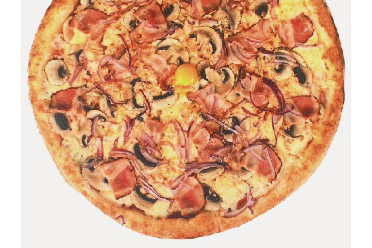 Тесто, лук красный, яйцо перепелиное, соус бешамель, бекон,шампиньоны, сыр моцарелла, тесто традиционное.