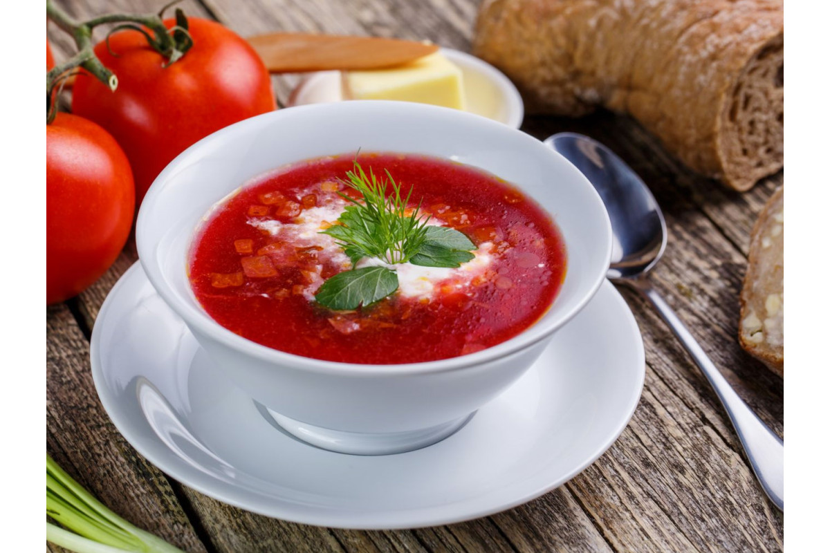 Говядина, картофель, свекла, капуста свежая, лук, морковь, тушенные с томатами, зелень, специи, сметана.